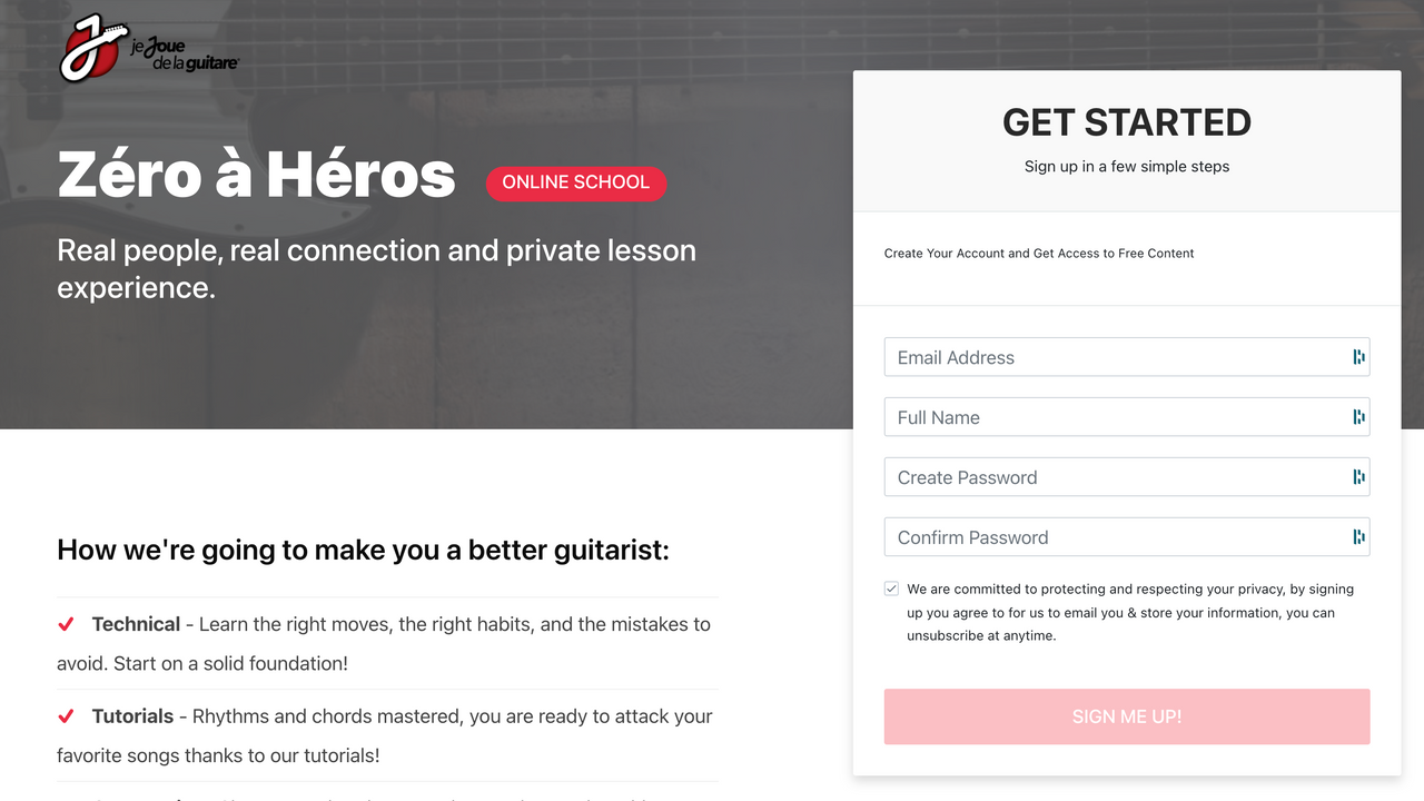 • Notre but est de vous donner plus qu'un simple cours de guitare en ligne, mais une réelle connection humaine. Ajoutez à cela le plaisir, le partage et la transparence dans notre entreprise : bienvenue chez nous!